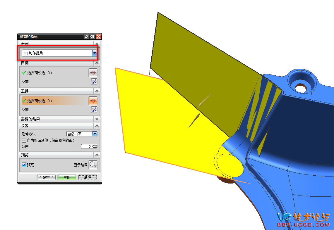 2.用“修剪和延伸”命令將兩個面創(chuàng)建拐角,注意類型選擇制作拐角,結(jié)果如圖所示