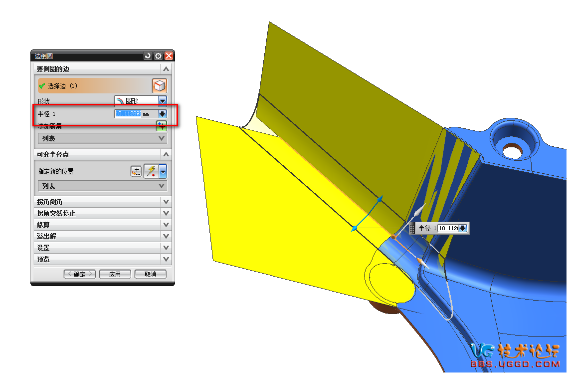 3.用“幾何屬性”命令測量兩個面之間的R角是多少,并且將R角的數(shù)據(jù)復(fù)制下來,然后用“邊倒圓”命令將R角倒上,粘貼R角的數(shù)據(jù)到半徑1對話框中,確定